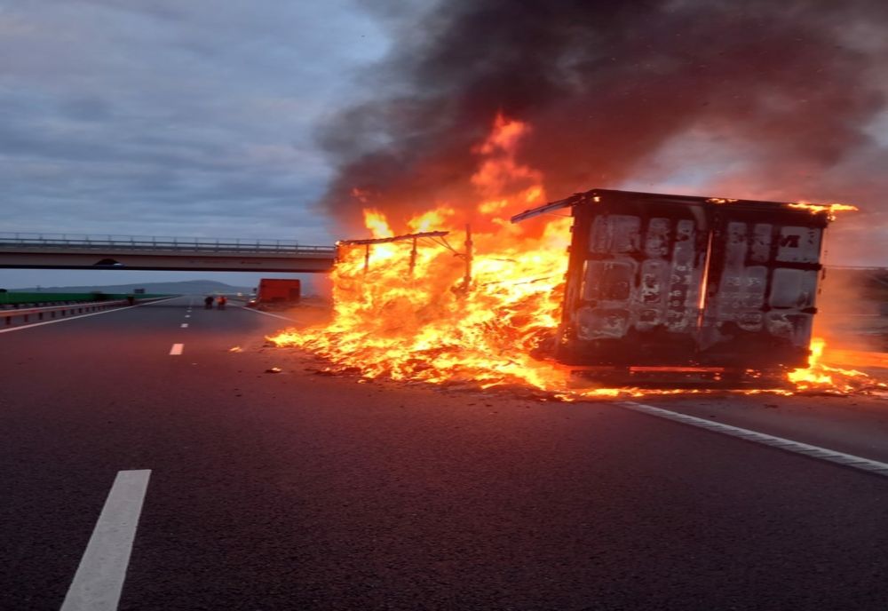 A ars generalizat o remorcă încărcată cu materiale textile, aceasta fiind desprinsă de capul TIR-ului. A ars remorca și materialele textile aflate în interiorul acesteia(aprox. 10 tone).