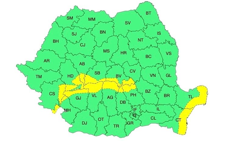 În județele Vrancea, Galați, Buzău, Brăila, Ialomița și Călărași vor fi intensificări puternice ale vântului cu rafale de 70...90 km/h, temporar va ninge viscolit, iar vizibilitatea va fi redusă.