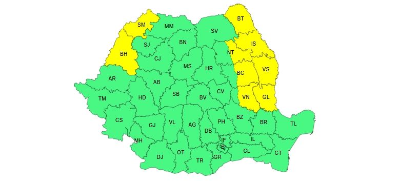 De asemenea, de sâmbătă, de la ora 10.00, până duminică la aceeaşi oră, este cod galben în mai bine de jumătate din ţară.
