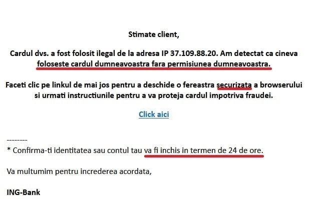 În același timp, ar trebui să ne dea de gândit chiar insistența cu privire la urgența nevoii de a ne 'verifica' datele contului, prezentă în mesaj atât la început (cineva folosește cardul dumneavoastră fără permisiunea dumneavoastrăț), cât și la final ('contul tău va fi închis in termen de 24 de ore').