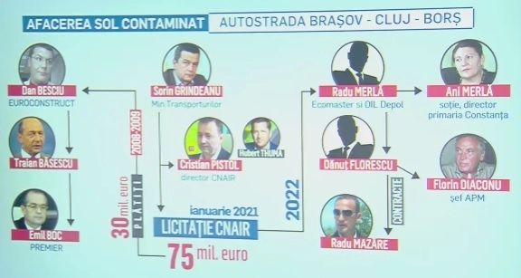 „Avem aici un Dan Besciu, prieten cu Traian Băsescu, proprietar al restaurantului Golden Blitz, iar afacerea se întâmpla la Cluj, pe vremea când șef al guvernului era Emil Boc. Nu cred că el n-a știut de această manevră. S-a ajuns la 75 de milioane de euro pentru igienizarea acelui petic de pământ. Cei de la CNAIR au spus stop joc. Dar, a rămas solul contaminat pe terenul lui Besciu. Vine CNAIR și spune că nu s-au putut preleva probe din sol. De la licitația din 2021 până în octombrie 2022 au trecut aproape 2 ani. Caietul de sarcini a fost făcut astfel încât să câștige cine trebuie. Șeful de la CNAIR, clebrul domn Pistol, trebuie să spună care e situația. Dan Besciu vrea să câștige bani de acolo fără să facă nimic.