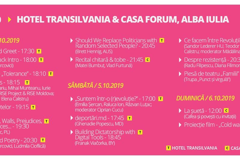 Timp de trei zile participanții sunt provocați să ia parte la un eveniment ce va aduce în Alba Iulia oameni dedicați comunității, printre cei mai relevanți sau inovatori din câteva domenii distincte: jurnalism, activism și artă.Evenimentul va avea parte de 17 speakeri și artiști, iar în public sunt așteptați peste 300 de participanți.Pe lista invitaților de marcă ai evenimentului se regăsesc nume cunoscute la nivel național și chiar internațional, precum: Ana Poenariu (jurnalist la RISE Project), Andrei Marcovici (muzician la Filarmonica din Sibiu), Anna Konik (artist - Polonia), Brett Hennig (președinte Sortition Foundation - Marea Britanie), Elena Calistru (Funky Citizens), Emilia Șercan (jurnalist la PressOne), Franak Viačorka (Digital Communication Nework - Belarus), Ghenadie Popescu (artist din Republica Moldova), Iurie Sănduță (jurnalist la Rise Moldova), Ludmila Cioflică (actriță în Trupa Skepsis), Mădălina Mocanu (Centrul pentru Studiul Democrației), Mihai Munteanu (jurnalist / RISE Project), Radu Filipescu (activist anti-comunist), Raluca Ion (jurnalist la Republica), Răzvan Luțac (jurnalist la Libertatea), Sandor Lederer (activist / K-Monitor - Ungaria) și Teodor Tița (consultant).De asemenea, în cadrul „civicON: (r)evoluții”, se vor desfășura 5 ateliere, cu număr limitat de participanți, dedicate elevilor și studenților (dar nu numai) ce urmăresc subiecte precum educația civică și gândirea critică, campanii în mediul online, potențiale abuzuri, (anti)propagandă, drepturile elevilor, dar și un inedit atelier de fanzin de revoluție .Cei interesați sunt așteptați la prezentările, discuțiile și atelierele ce vor avea loc la Hotel Transilvania și la Casa Forum (str. Simion Bărnuțiu, nr. 10, Alba Iulia).Intrarea la toate evenimentele „civicON: (r)evoluții” este GRATUITĂ!