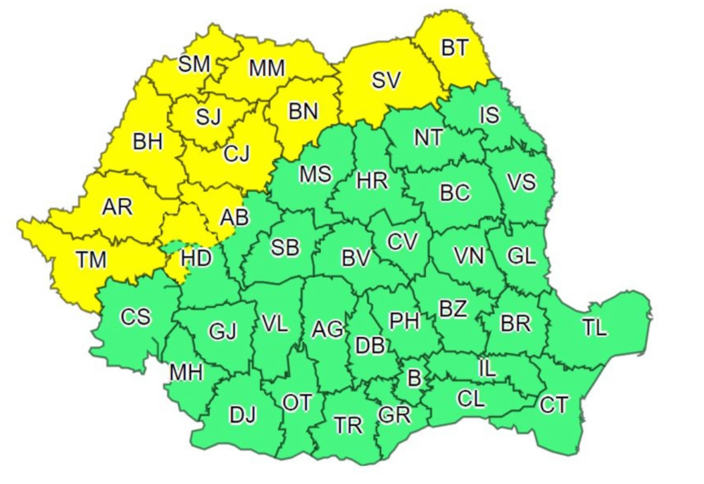 Meteorologii au emis marți o avertizare Cod galben de instabilitate atmosferică valabilă în 12 județe din țară. Potrivit ANM, sunt vizate județele Botoșani, Suceava, Bistrița-Năsăud, Maramureș, Satu Mare, Cluj, Sălaj, Bihor, Alba, Hunedoara, Arad și Timiș.