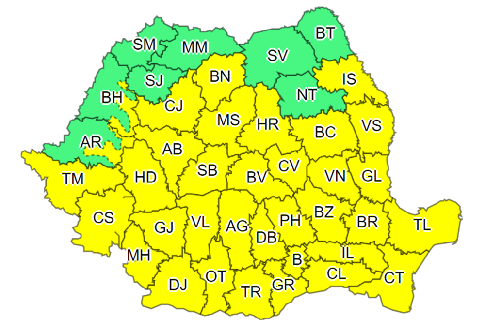 Administrația Națională de Meteorologie a emis sâmbătă dimineață o atenționare de ploi și furtuni valabilă pentru aproape întreaga țară, începând de la ora 12:00, până la ora 23:00.