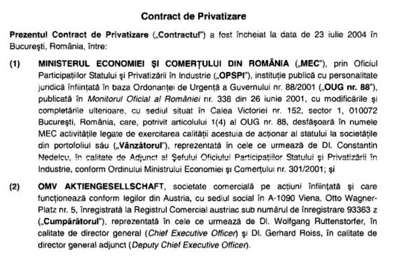 Contractul de privatizare a companiei Petrom a fost semnat la Palatul Victoria, in prezenta primului ministru de atunci Adrian Nastase si a ministrilor Dan Ioan Popescu si Martin Bartenstein, de seful Oficiului Participatiilor Statului si Privatizarii in Industrie, Constantin Nedelcu (D), presedintele OMV, Wofgang Ruttenstorfer (S), si vicepresedintele grupului austriac, Gerhard Rois.