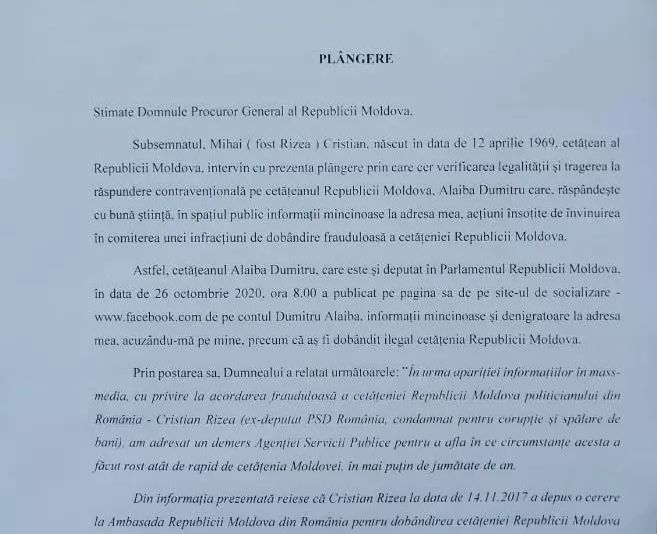 Cristian Rizea solicită Procurorului General al Republicii Moldova să verifice legalitatea modului în care Alaiba Dumitru răspândește în spațiul public informații false privind felul în care fostul deputat PSD a dobândit cetățenia moldovenească.