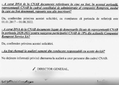 Este documentul intern prin care directorul general CNAB cerea subalternilor să pună la dispoziția DNA toate documentele și convorbirile și discuțiile în urma emisiunii noastre”, a reamintit Anca Alexandrescu.