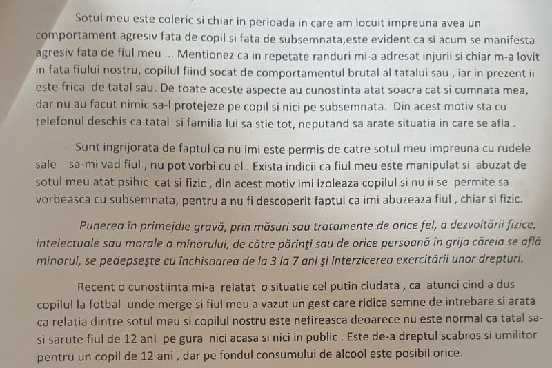 Mama nu este lăsată să își vadă copilul și susține că acesta este obligat să stea cu bunica acestuia la o distanță de 30 de km de școala pe care o fregventează. Femeia a încercat în nenumărate rânduri să își vadă copilul însă susține că a fost oprită cu brutalitate.