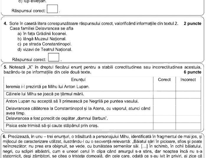 Textul 1: „În port, la pupa vasului de pasageri austriac, care tocmai venise din sus, se vedea legat la chei* un barcaz* micuț, încărcat din greu. Cam în partea lui din mijloc, pe o stivă de scânduri, şedea, cu picioarele atârnate în jos, un băieţandru de vreo şaisprezece ani, cu un mintean* negru pe umeri, cu o căciulă de oaie dată pe ceafă, şi cânta încetişor, ca pentru el, dintr-un fluier ciobănesc.