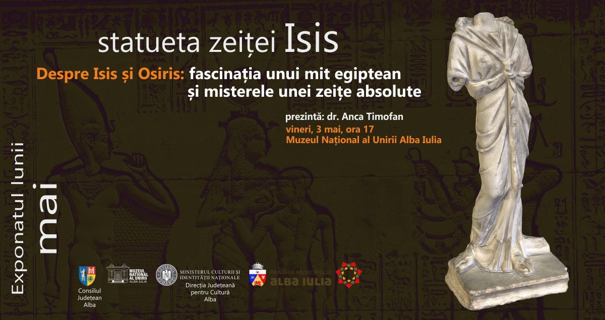 Sculptura votivă din marmură a fost descoperită în 1969 în Alba Iulia și o înfățișează pe zeiță într-o ipostază clasică.Isis a reprezentat divinul feminin atotputernic, fiind una dintre cele mai importante zeităţi ale lumii antice.Ea evoluat în mod extraordinar de la atributele ei tradiţionale de zeiţă egipteană majoră, la o identitate nouă, mult mai complexă, dobândită în spaţiul religios greco-roman, unde va fi centrul unui cult de mistere remarcabil.Cultul isiac s-a răspândit cu rapiditate în lumea mediteraneană, adepţii lui atribuindu-i marii zeiţe venite din Egipt aproape toate puterile divine feminine, toate însușirile specifice zeiţelor panteonului greco-roman și nu numai.Alături de statueta Isidei, va fi expusă și o mică statuetă din bronz reprezentându-l pe Osiris, al cărui mit se construiește în jurul personalității magice și salvatoare a zeiței care i-a fost soție și soră divină.Despre Isis și Osiris vă va povesti dr. Anca Timofan, arheolog în cadrul Secției Arheologie-Cercetare a muzeului.Veți putea vedea atât sculptura romană cât și replica ei realizată prin imprimarea 3D pe baza modelului obținut în urma scanării piesei cu ajutorul luminii structurate în cadrul programului cultural Pantheon 3D, implementat de Muzeul Național al Unirii Alba Iulia și co-finanțat de AFCN.Manifestarea este organizată de Consiliul Județean Alba, Primăria Municipiului Alba Iulia și Muzeul Național al Unirii Alba Iulia.