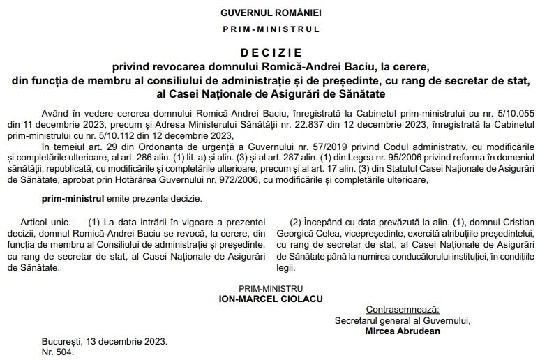 Vicepreședintele Cristian Celea a fost numit la șefia CNAS și va exercita atribuțiile președintelui, cu rang de secretar de stat, până la numirea conducătorului instituției, potrivit deciziei premierului. Marcel Ciolacu a semnat și revocarea din funcție, la cerere, a fostului șef CNAS - Andrei Baciu. Acesta și-a anunțat demisia de onoare din funcție înainte de a fi audiat la DNA în dosarul achizițiilor vaccinurilor anti-COVID în pandemie.