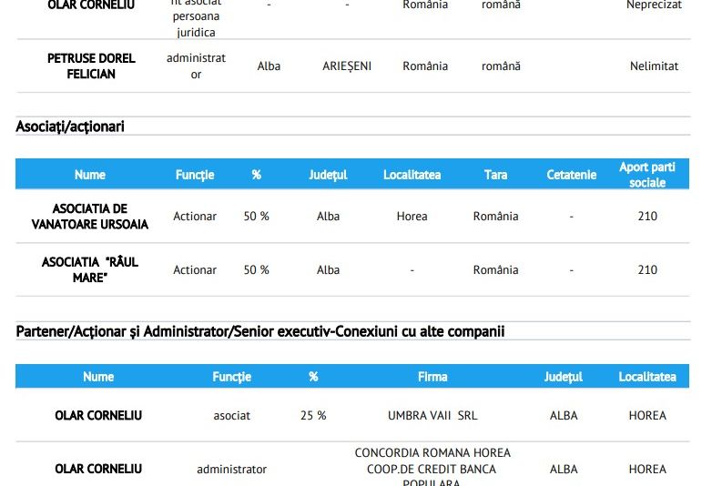 Despre pădurile din Munții Apuseni, rase în mod sistematic s-au scris sute de articole. Tăierile masive din ultimii ani a făcut ca zeci de hectare de pădure să fie transformate pur și simplu în pășuni. Privind de la cel mai înalt pol al județului Alba la limită cu Cluj zonă aflată în administrarea Ocolului Silvic privat Horea Apuseni care se îngrijește de aproape 26.000 de hectare de pădure din cele două județe și coborând pe Valea Arieșului până la Poșaga și Ocoliș găsim mii de metri cubi de lemn tăiați ilegal. Din această mafie de prădători fac parte politicieni, polițiști, oameni de afaceri primari și pădurari.Cum arată schema perfectă a celui mai mare jaf de resursă a țăriiDupă ce în presa locală din Cluj a apărut o informație legată de de un prejudiciu colosal, redacția noastră l-a contactat pe șeful Gărzii Forestiere Regionale de la Cluj, Istrate Stetco care a confirmat că pe raza a cinci comune din Munții Apuseni, în perioada 2007 – 2017 vorbim de peste 140.000 de material lemnos dispărut.” Urmare a unei autosesizări a Gărzii Forestiere Cluj într-o suprafață de fond forestier cu contract de servicii silvice încheiat de către proprietar cu Ocolul Silvic Horea Apuseni SRL, unde am efectuat verificări în teren și am comparat datele înscrise în amenajamentul silvic ediția 2007 cu datele înscrise în amenajamentul silvic ediția 2017, constatând că a dispărut un volum de masă lemnoasă de 142.803 mc, cu o valoare a pagubei de 18.202.610 lei la care se adaugă TVA în valoare de 3.458.496 lei și o valoare a funcțiilor pădurii nerealizate de 12.195.748 lei (calculată la data constatării), iar în acest sens Garda Forestieră Cluj a sesizat unitatea de parchet competentă teritorial și material.” – arată o adresă a Gărzii forestiere.Cireașa de pe tort în această zonă a Apusenilor este Ocolul Silvic Horea Apuseni. Și aici surpriza, unul dintre acționarii ocolului este o asociație de vânătoare din care face parte deputatul liberal Corneliu Olar. De-a lungul anilor, Olar, și-a construit o adevărată filieră de masacrare a pădurilor bazată pe familie, mediul politic dar și frății dubioase cu interlopi ai zonei care au legături directe cu oamenii legii din zonă. Unii taie lemnul în pădure, alți îl transportă, unii se ocupă de documente iar alții îl vând mai departe și totul dispare.Ocolul Silvic Horea Apuseni administrează pădurile comunelor Horea, Albac, Gârda, Vadul Moților și Scărișoara în zona de confluență a județelor Alba și Cluj. În județul Alba, Ocolul Silvic Horea Apuseni SRL are o suprafaţă totală de fond cinegetic de 11.194,38 de hectare și o suprafaţă de arii naturale protejate de 4.420,72 de hectare. În județul Cluj, ocolul respectiv are o suprafaţa totală fond cinegetic de 10.229,78 ha și o suprafaţă de arii naturale protejate de 127,25 de hectare. În total, ocolul silvic privat administrează o suprafață totală 25.972,13 hectare despre care localnicii spun că este fieful familiei deputatului Corneliu Olar.