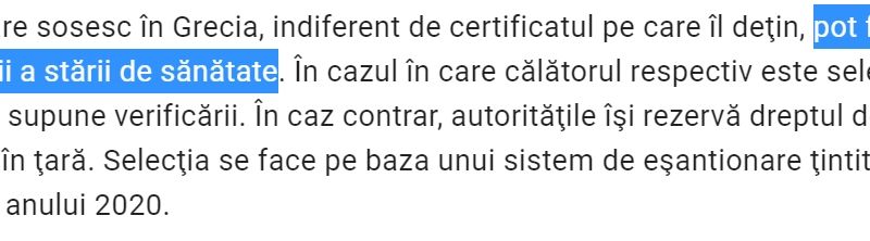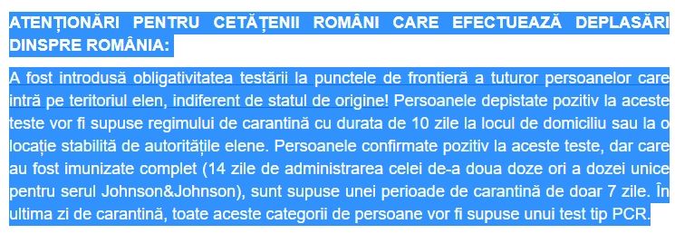 Precizarea vine după ce purtătoarea de cuvânt a MAE a anunțat miercuri seară că Grecia impune noi reguli pentru turiștii care vor să intre în țară: toți cei vin pe cale terestră vor fi testați la Covid-19.
