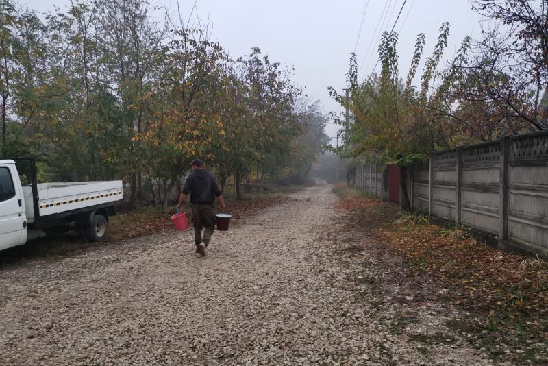 Pentru a-și hrănii animalele dar și pentru apa necesară în gospodărie, Alexandru este nevoit în ultima perioadă să facă mai multe drumuri pentru a se aproviziona cu apa necesară.