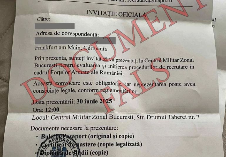 Ministerul Apărării Naționale (MApN) atrage atenția asupra unei campanii de dezinformare care vizează cetățenii români stabiliți în afara țării. Recent, o parte dintre aceștia au semnalat primirea unui document fals, prin care ar fi convocați la un centru militar din România pentru „evaluarea și inițierea procedurilor de recrutare în cadrul Forțelor Armate ale României”.