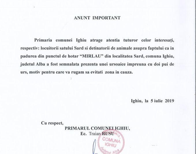 ”Primăria Comunei Ighiu atrage atenția tuturor celor interesați, respectiv: locuitorii satului Șard și deținătorilor de animale asupra faptului că în pădurea din punctul de hotar Mirălău a fost semnalată prezența unei ursoaice împreună cu doi pui de urs, motiv pentru care vă rugăm să evitați zona în cauză”