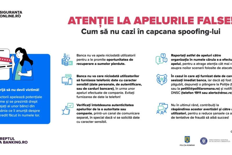 Avertismentul asupra acestei noi campanii frauduloase prin apeluri telefonice false (spoofed) a fost transmis, marți, de către Directoratul Național de Securitate Cibernetică (DNSC), Poliția Română și Asociația Română a Băncilor (ARB), potrivit unui comunicat de presă. „În ultimele zile, este activă o campanie care se folosește de numele unor bănci pentru apeluri false (spoofed) în care atacatorii apelează potențiale victime și se prezintă drept angajați ai acestora. Spoofing-ul numărului de telefon este o tehnică de înșelăciune prin care un atacator își modifică numărul de telefon astfel încât să apară pe ecranul persoanei apelate un alt număr decât cel real”, se arată în comunicatul citat.