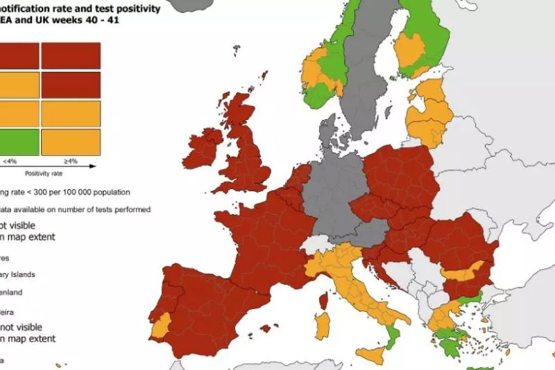 Pe harta prezentată de ECDC, întocmită conform noului cod de culori, doar trei ţări din UE sau Spaţiul Economic European (Norvegia, Finlanda şi Grecia) sunt în mare parte în zona verde, zona sigură.