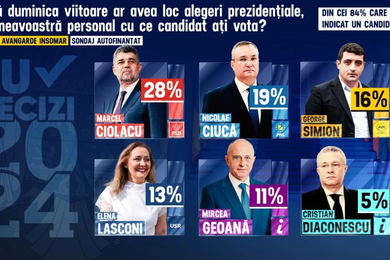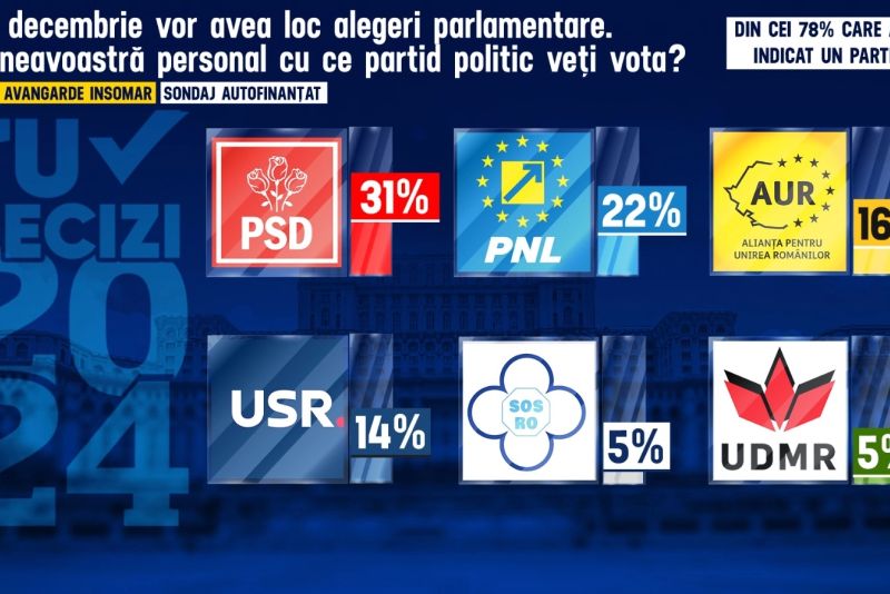 Potrivit unui sondaj de opinie autofinanțat realizat de Avangarde-INSOMAR care a măsurat intenția de vot pentru cele două tipuri de alegeri de la finalul acestui an, prezidențiale și parlamentare, Marcel Ciolacu și PSD domină în topul preferințelor românilor, însă din urmă vin puternic Nicolae Ciucă și PNL. Poziția a treia în topul preferințelor românilor este ocupată de George Simion (AUR).