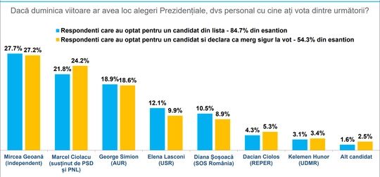 Raportat la cei care au exprimat o preferinţă pentru un candidat din listă (nu au fost luaţi în considerare nehotărâţii şi non-răspunsurile) şi acordă nota 10 la întrebarea privind prezenţa la vot (54.3% din total eşantion), 27.2% dintre alegători ar vota pentru Mircea Geoană (independent), 24.2% pentru Marcel Ciolacu (susţinut de PSD şi PNL) şi 18.6% pentru George Simion (AUR). Pentru Elena Lasconi (USR) ar opta 9.9% dintre alegători, iar pentru Diana Şoşoacă (SOS România) 8.9%. Dacian Cioloş (REPER) ar fi ales de 5.3% dinte votanţi, iar Kelemen Hunor (UDMR) de 3.4%. 2.5% spun că ar vota alt candidat.