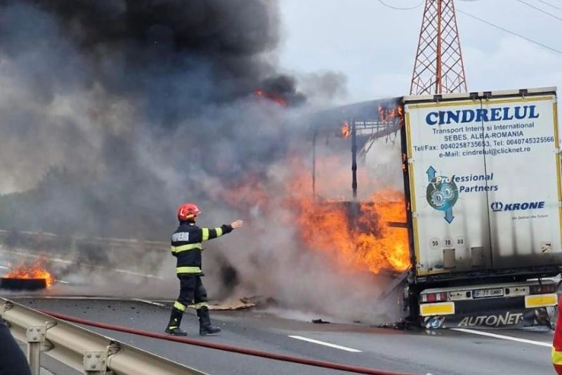 Circulația a fost oprită pe autostrada A1, km 17+800, c1, din cauza unui TIR care a luat foc în mers.