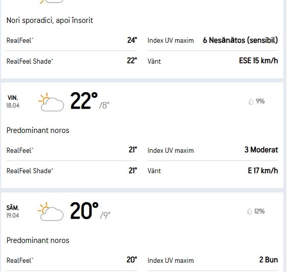 „O vreme în încălzire de la o zi la alta. Începând de miercuri, temperaturile maxime la scara întregii țări vor fi cuprinse între 13 până la 26 de grade, pragul unei zile de vară, chiar peste, având în vedere limita acestuia de 25 de grade Celsius.