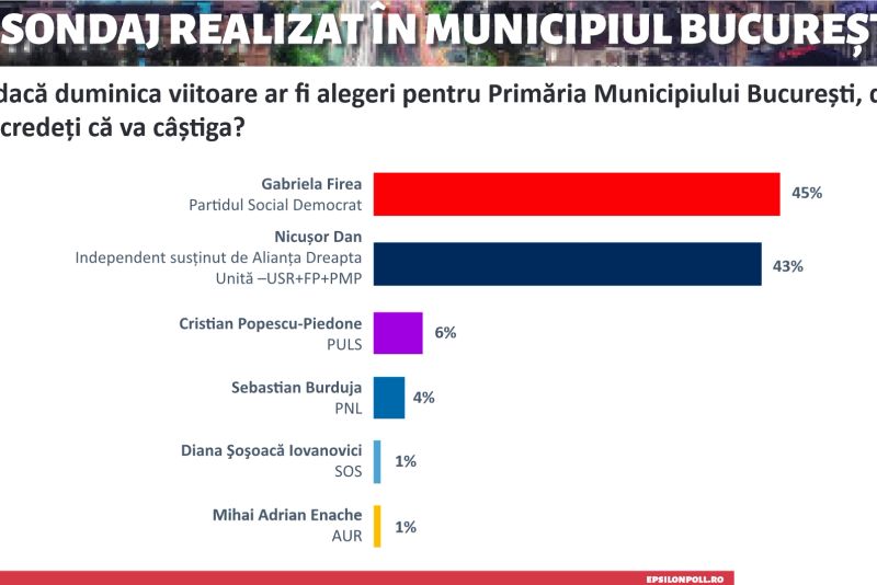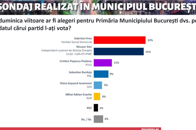 Un sondaj recent Epsilon Poll realizat pentru alegerile din București arată că Gabriela Firea îl devansează pe actualul primar Nicușor Dan