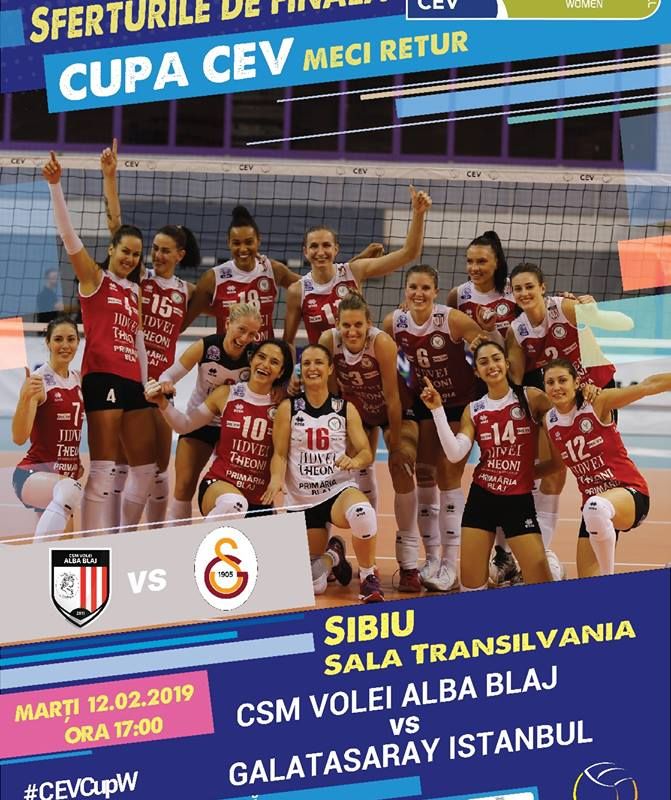 Meciul Volei Alba Blaj - Galatasary Istanbul se va disputa marți, 12 februarie în Sala Transilvania din Sibiu și va începe la ora 17:00. Intrarea este liberă.„